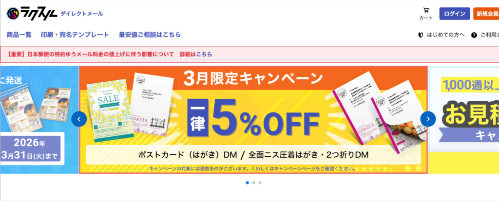 ラクスルは、印刷・集客支援のプラットフォームとして知られる企業が運営するDM発送代行サービスです。Web上の操作だけで印刷から宛名印字・発送までを完結でき、最短当日発送にも対応しています。1通から発注可能なため、小規模なテスト発送から大量発送まで柔軟に利用できます。