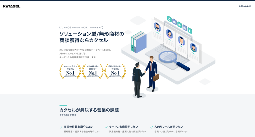 カタセルは、大手・中堅企業の決裁者との商談獲得に特化した手紙営業代行サービスです。約24,000社の企業データベースを活用し、専門のリサーチ部隊がターゲット企業のキーマンをバイネームで特定した上で、企業ごとにパーソナライズしたセールスレターを作成します。