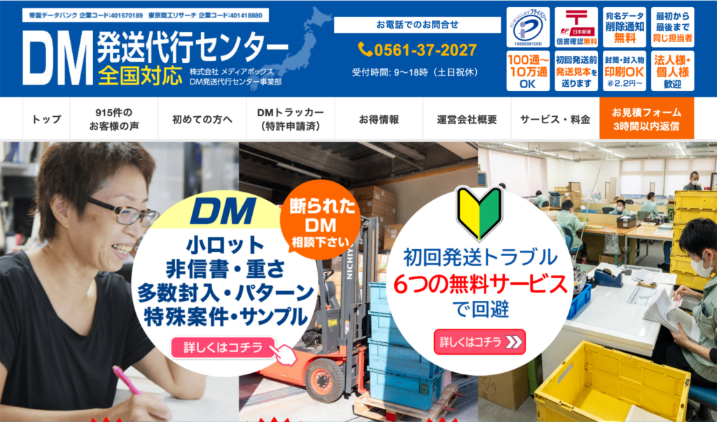 DM発送代行センター50〜10万通まで対応可能。見積もり3営業時間以内の回答体制。専任担当制で進捗をこまめに報告。従量課金型要見積もり