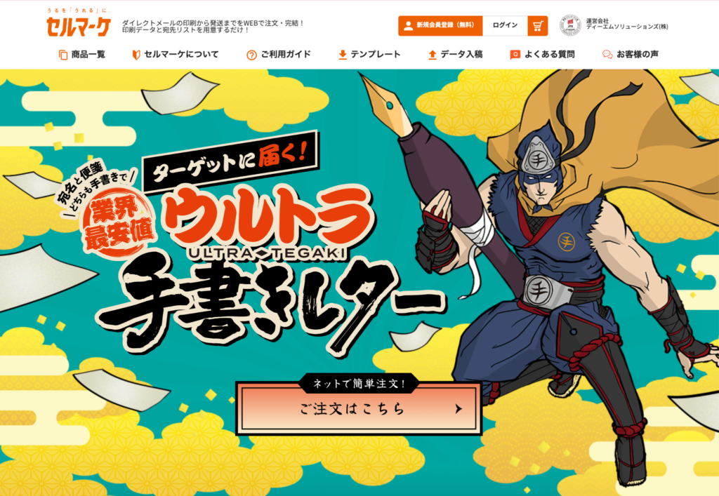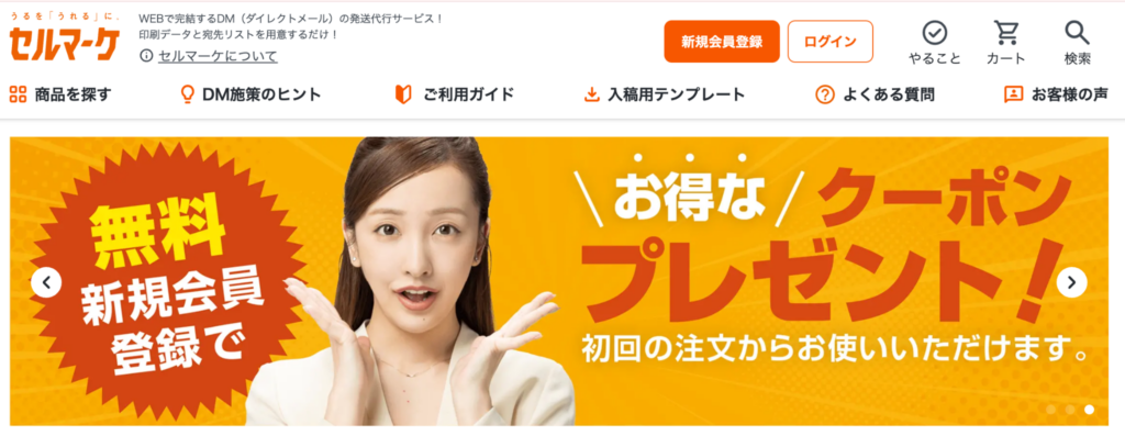 セルマーケは、DM印刷から宛名ラベルの貼り付け、封入、発送までをWeb上で完結できるDM発送代行サービスです。印刷・発送コストの削減に力を入れており、業界最安レベルの価格を実現している点が大きな特徴です。