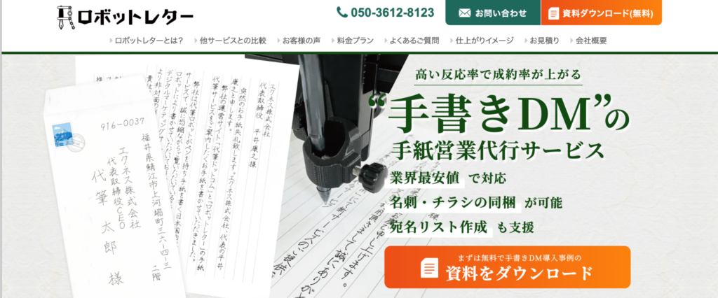 ロボットレターロボットによる手書き代筆で低コストを実現。越前和紙の便箋を使用。累計800万通以上・1,000社以上の実績。最短5営業日で発送。従量課金型1通330円〜(税込)