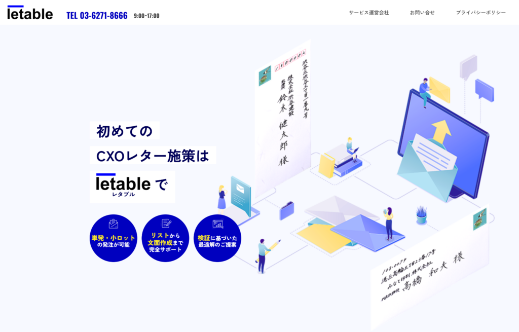 letable(レタブル)手紙営業に特化。独自検証に基づく文面フォーマットを用意。単発・小ロットでの発注が可能で、施策1回ごとの契約に対応。要問い合わせ要問い合わせ