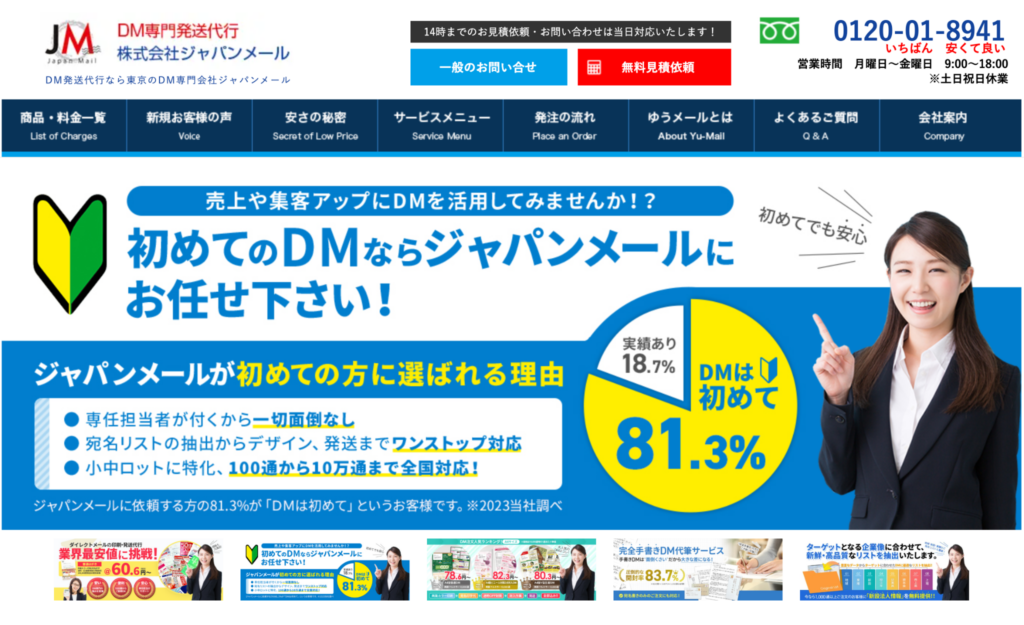 株式会社ジャパンメールは、年間1,600万通以上の発送実績を持つDM発送代行サービスです。DMの企画・デザインから印刷、封入・封緘、発送までをワンストップで提供しており、日本郵便との直接契約による低コスト発送を実現しています。