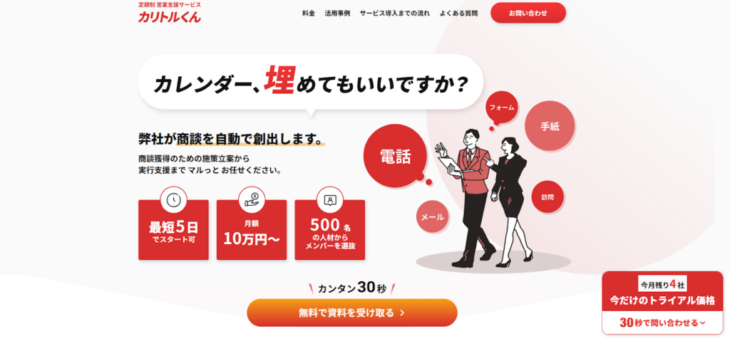 カリトルくん7つの営業手法を組み合わせ、商談獲得まで伴走する定額型の営業支援。累計700社以上の支援実績。固定報酬型月10万円〜