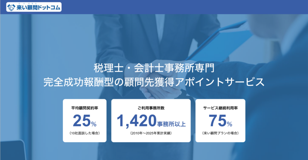 | 特徴 | 税理士・会計事務所に特化した顧問先獲得アポイントサービス。1,420事務所以上の利用実績。顧問契約率約25%。完全成功報酬型のプランあり。 |