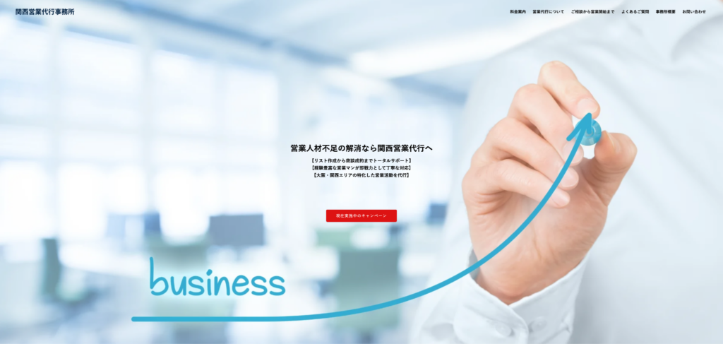 | 関西営業代行事務所 | 従業員10人以下の中小企業・個人事務所に特化。見込み客獲得から商談・クロージングまで一気通貫で代行。Web集客支援にも対応。 | 固定報酬型 | テレアポ:1コール150円〜/営業代行:要問い合わせ |
